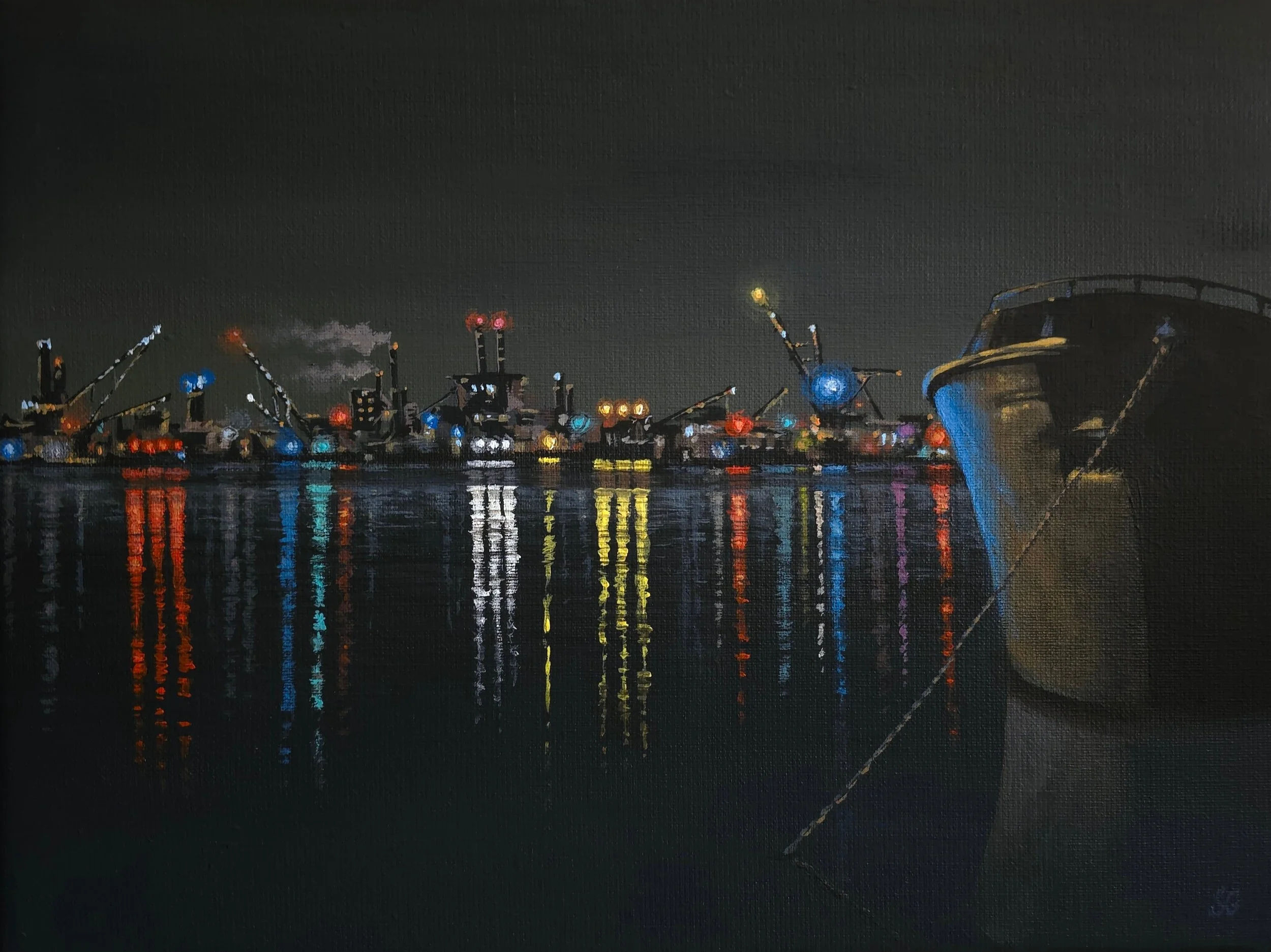 I tried to capture the quiet beauty and vivid reflections of light dancing across calm waters beneath a deep dark sky. The movement pauses, and one can feel grounded amid the stillness. The ship in the foreground anchors the viewer, symbolizing the feeling of arriving at home after a long journey.