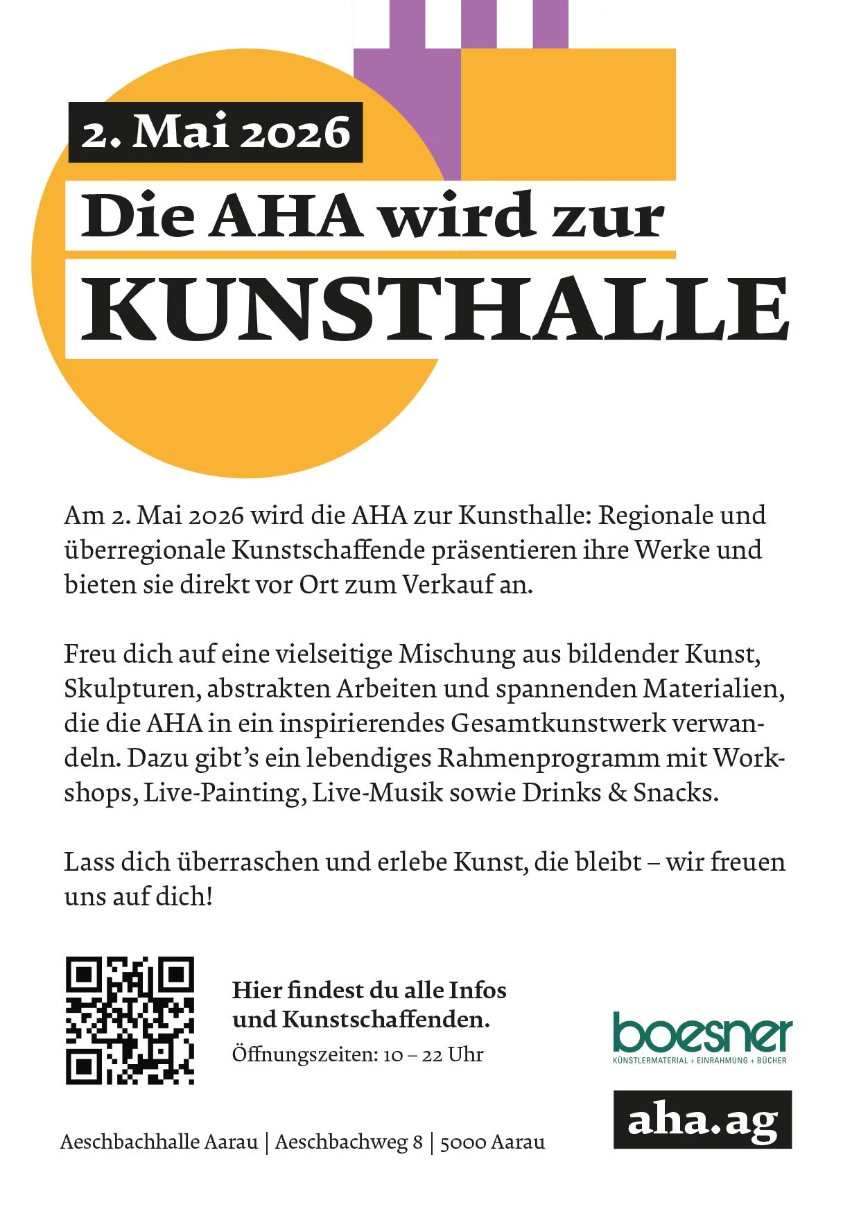 Kunstmarkt at AHA in Aarau Saturday, May 2, 2026 10:00 AM 9:00 PM Aeschbachhalle 6 / AHA Aeschbachweg 8 5000 Aarau Switzerland (map) Google Calendar ICS More info here:https://www.aha.ag/